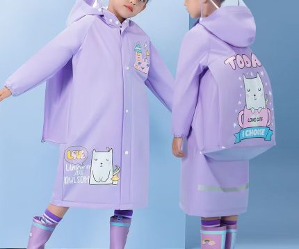Kids’ Waterproof Cartoon Raincoat with Backpack Cover – Purple